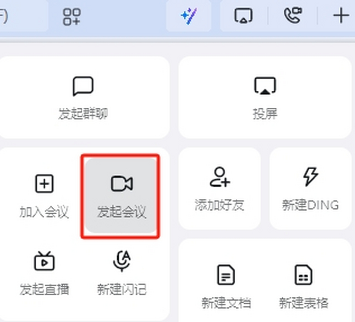 打开钉钉PC客户端并登录>>单击客户端右上角+号图标进入加号面板>>点击发起会议。